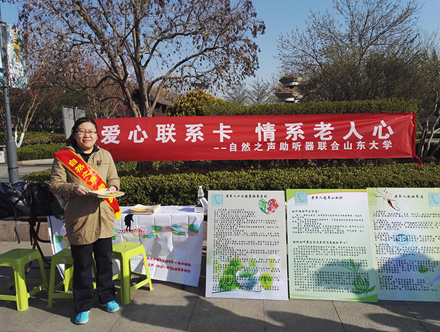 2016年3月27日,自然之声济南经七路验配中心联合山东大学,于英雄山赤霞广场举办“爱心联系卡,情系老人心”活动,活动当天,阳光明媚,风和日丽,一张张小小的卡片温暖着每一位在场老人的心弦。